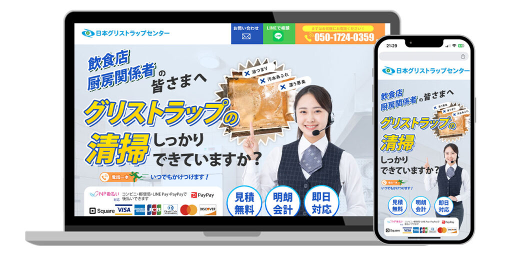 グリストラップの清掃という飲食店では重要そうなタスクを請け負うお仕事のLPです。